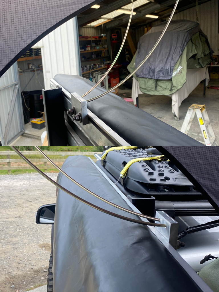 When installing a 270 awning next to a soft shell rooftop tent, the rear spring poles for your rainfly can sometimes be obstructed by the awning arms. The Lucas Creek Rainfly Pole Adapter Kit solves this issue by allowing you to mount the spring poles directly to your awning, so you can set up the rainfly properly without interference.